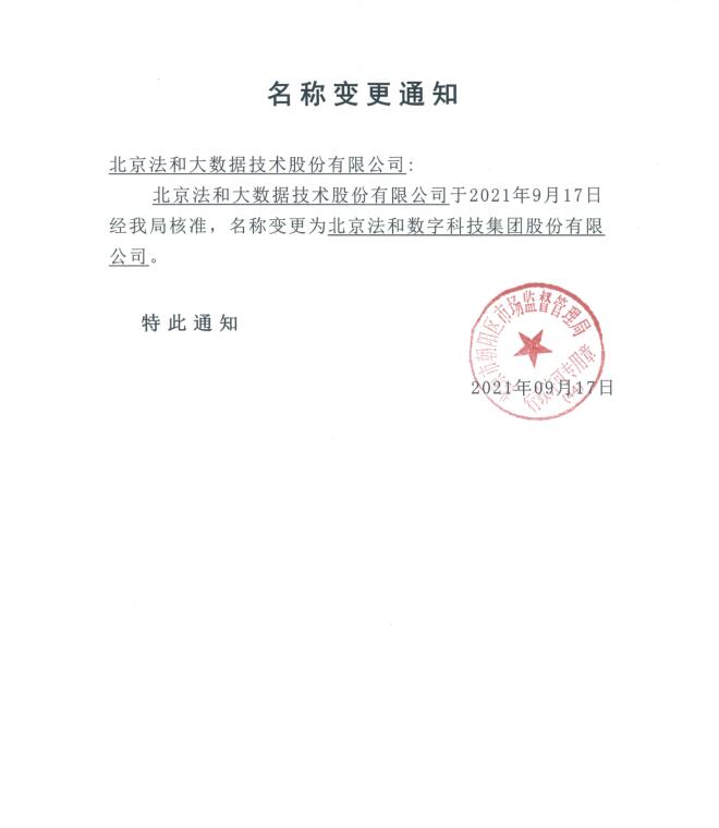 因公司業(yè)務(wù)發(fā)展需要,我司決定將公司名稱由“北京法和大數(shù)據(jù)技術(shù)股份有限公司”變更為 “北京法和數(shù)字科技集團(tuán)股份有限公司”。經(jīng)北京市朝陽區(qū)市場(chǎng)監(jiān)督管理局核準(zhǔn),于2021年09月17日已辦結(jié)公司名稱變更的工商手續(xù)。從變更之日起,公司以 “北京法和數(shù)字科技集團(tuán)股份有限公司”對(duì)外開展經(jīng)營(yíng)活動(dòng)。